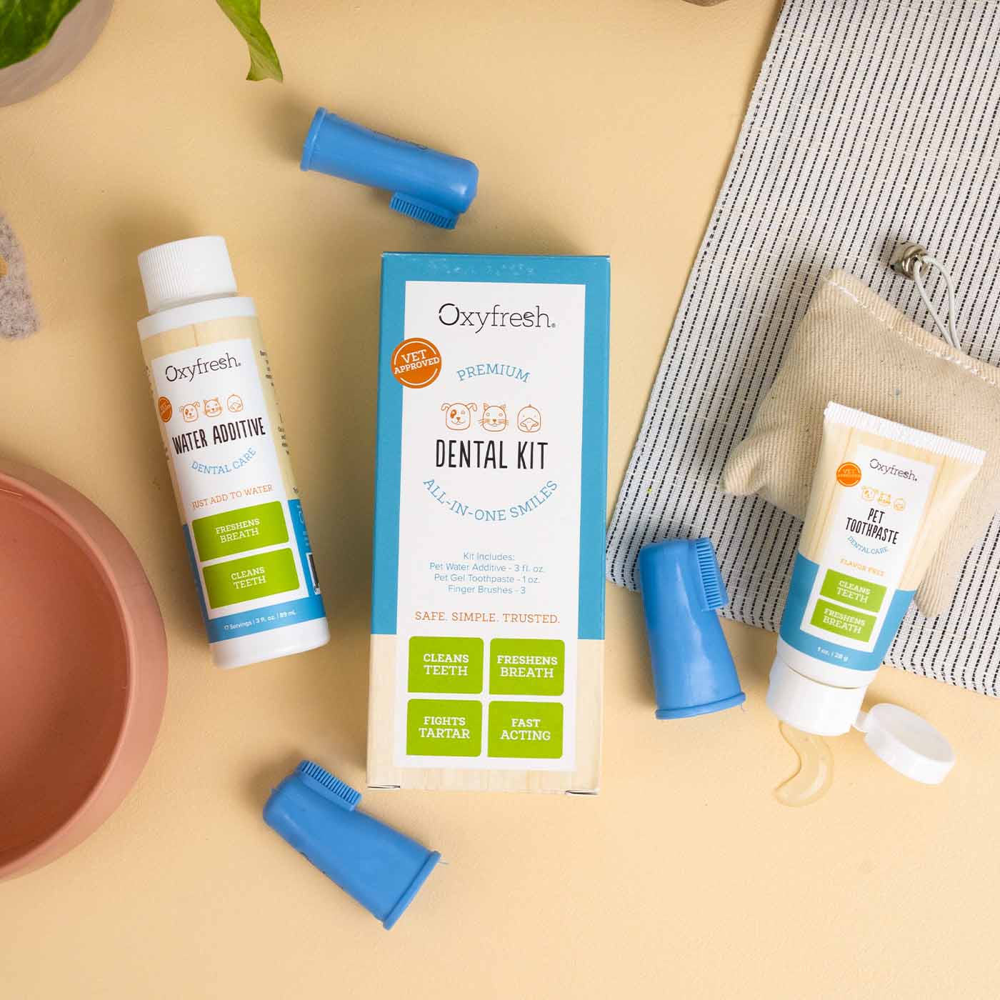 Bundle and save on all the essentials to keep your sidekick's smile in tip-top shape. Our dental care kits for pets feature our top-selling Pet Dental Water Additive alongside the Pet Dental Gel Toothpaste plus easy-to-use finger brushes. Hello fresh breath & clean teeth!